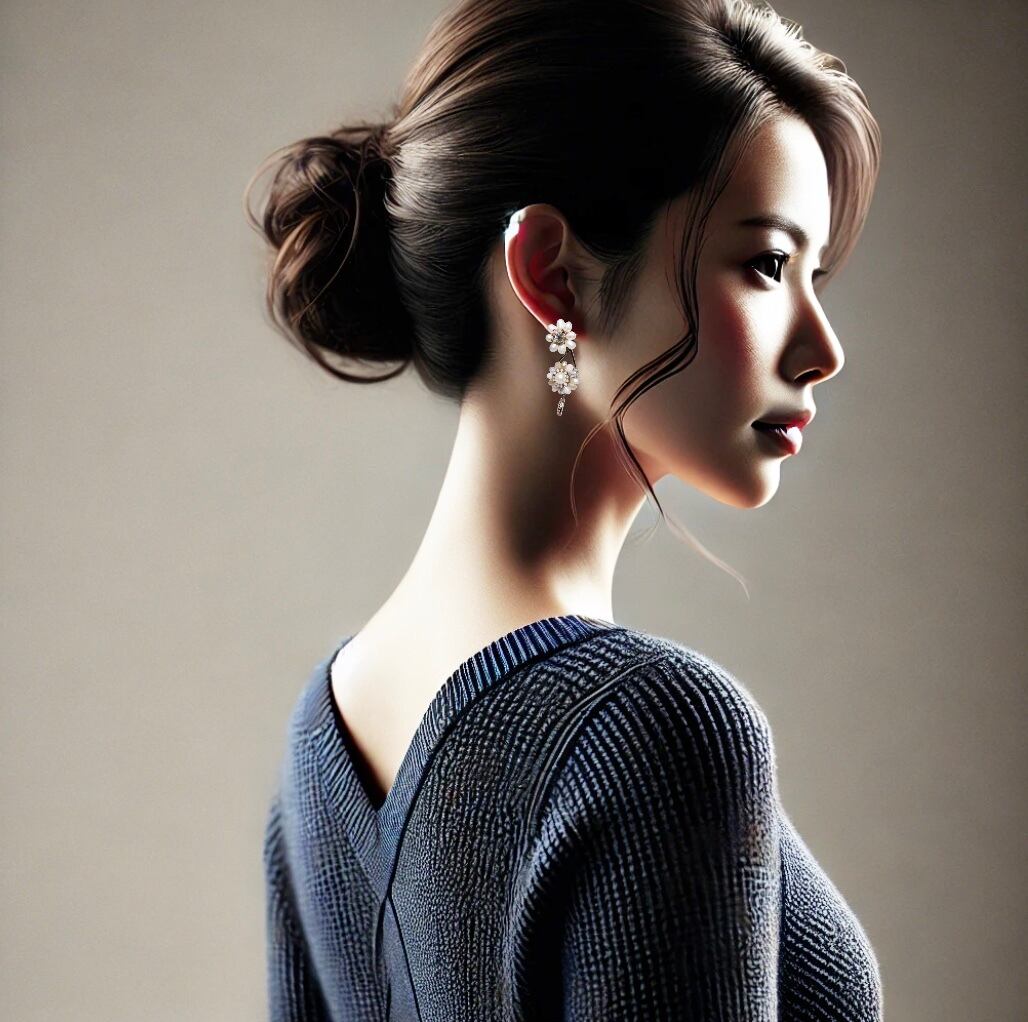 • カジュアルスタイル: ベージュやアイボリーのトップスに合わせれば、柔らかいパールの輝きがナチュラルなコーデに洗練をプラスします。