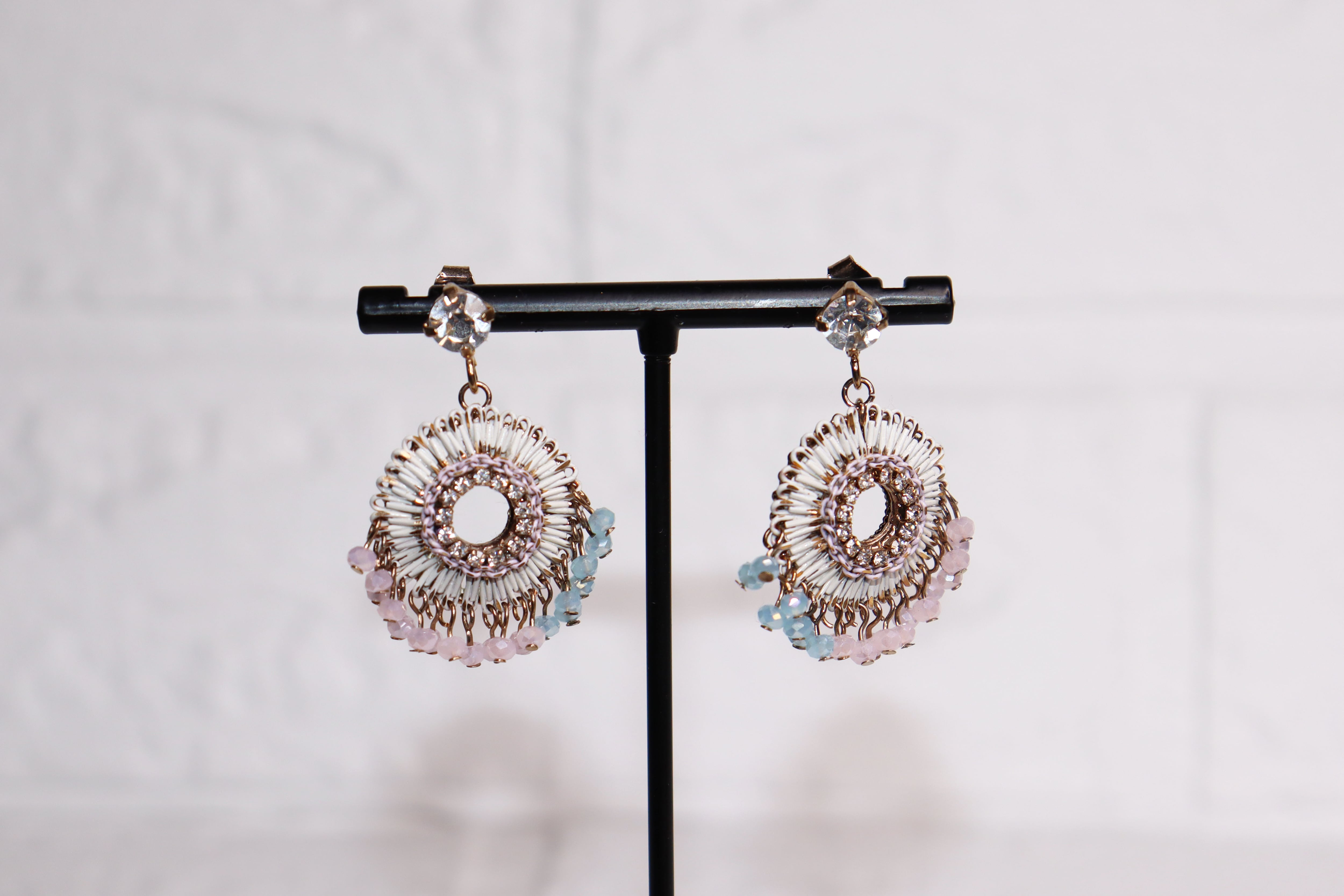 ミスティックランドピアスは、淡いピンクとブルーのビーズが織りなす幻想的なデザインが魅力。シンプルな装いにこのピアスをプラスするだけで、まるで自然の中にいるようなリラックス感を演出します。